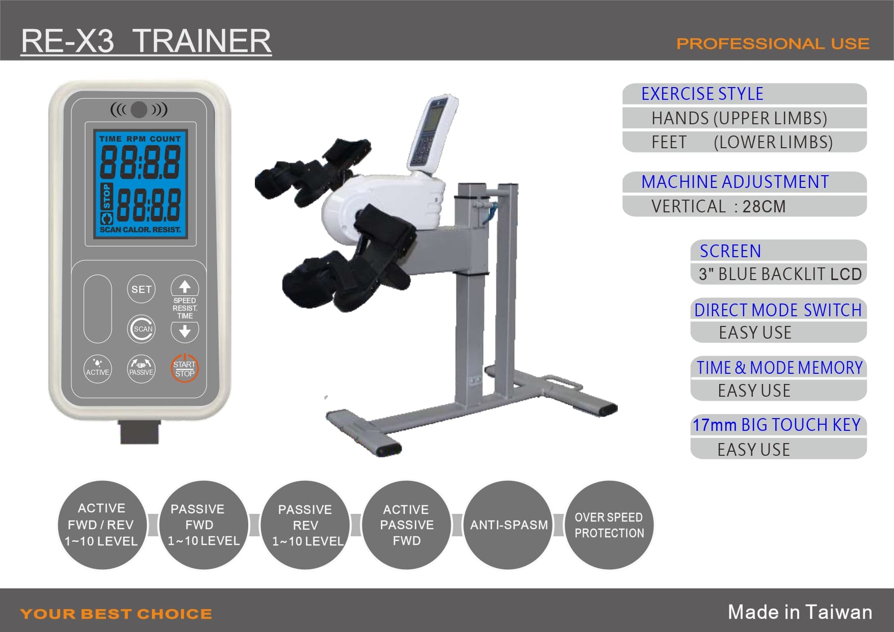 Modes: Passive and active exercise with height-adjustable setup; upper or lower limb training by swapping crank attachments for handles or feet.